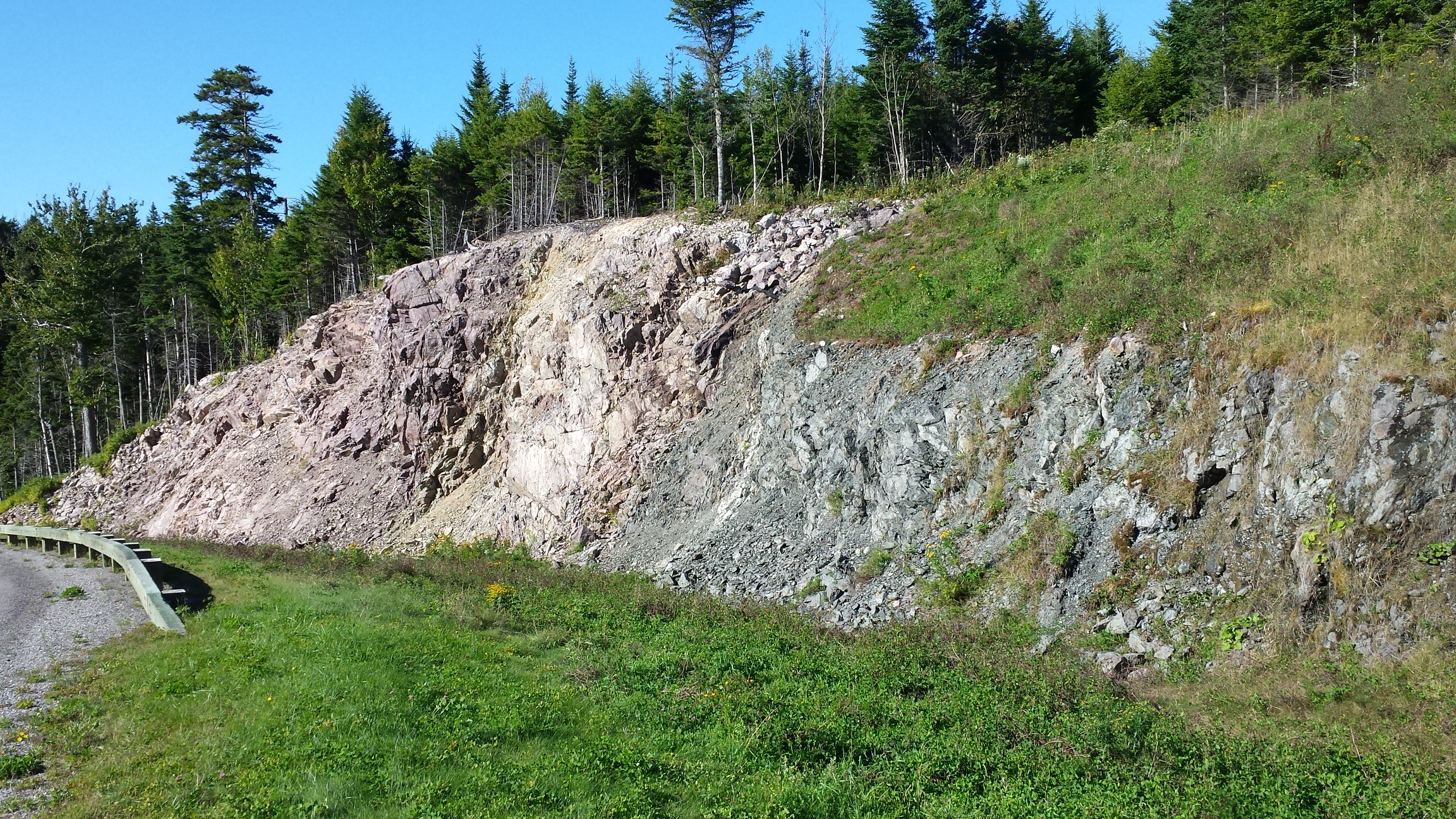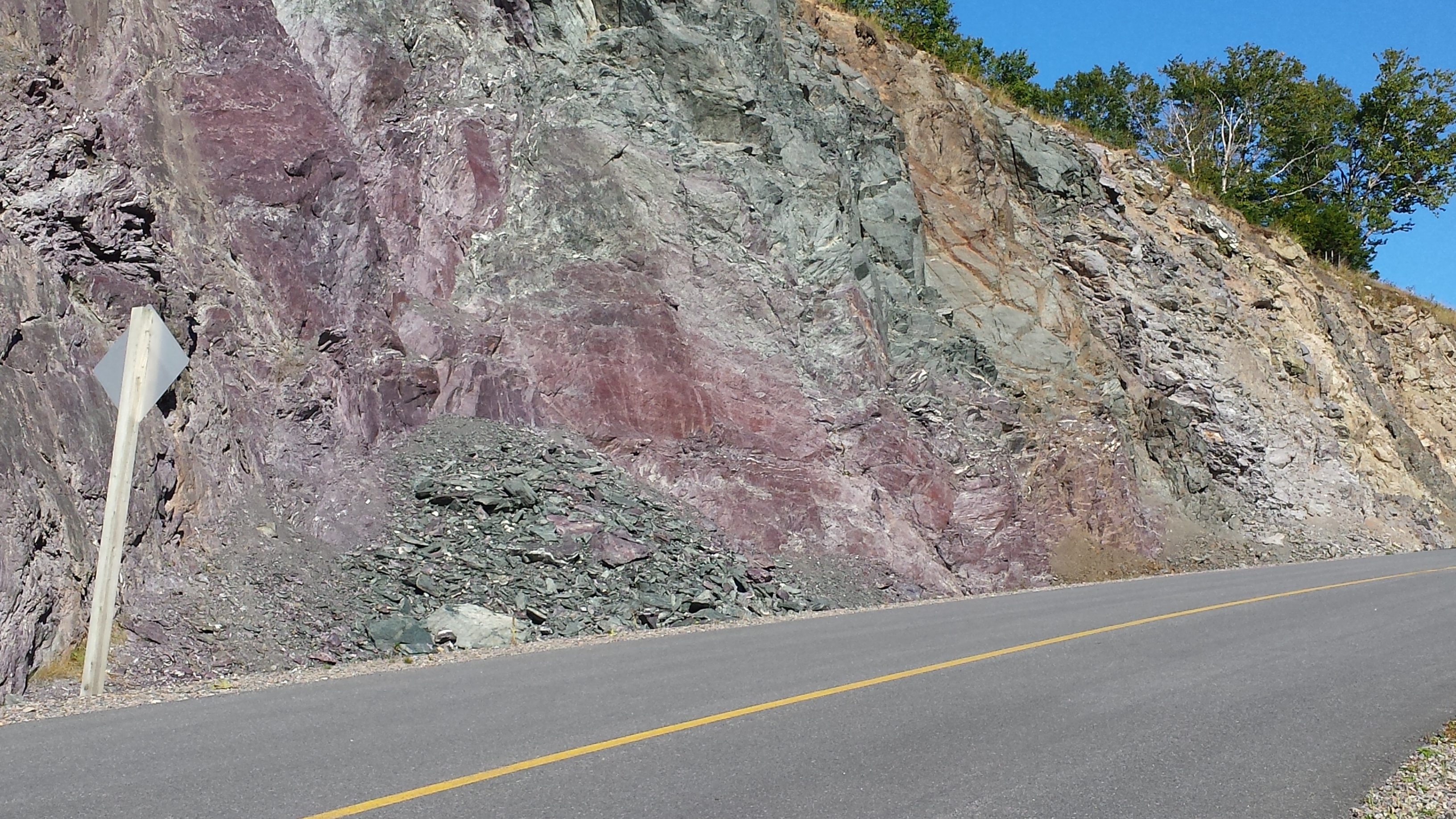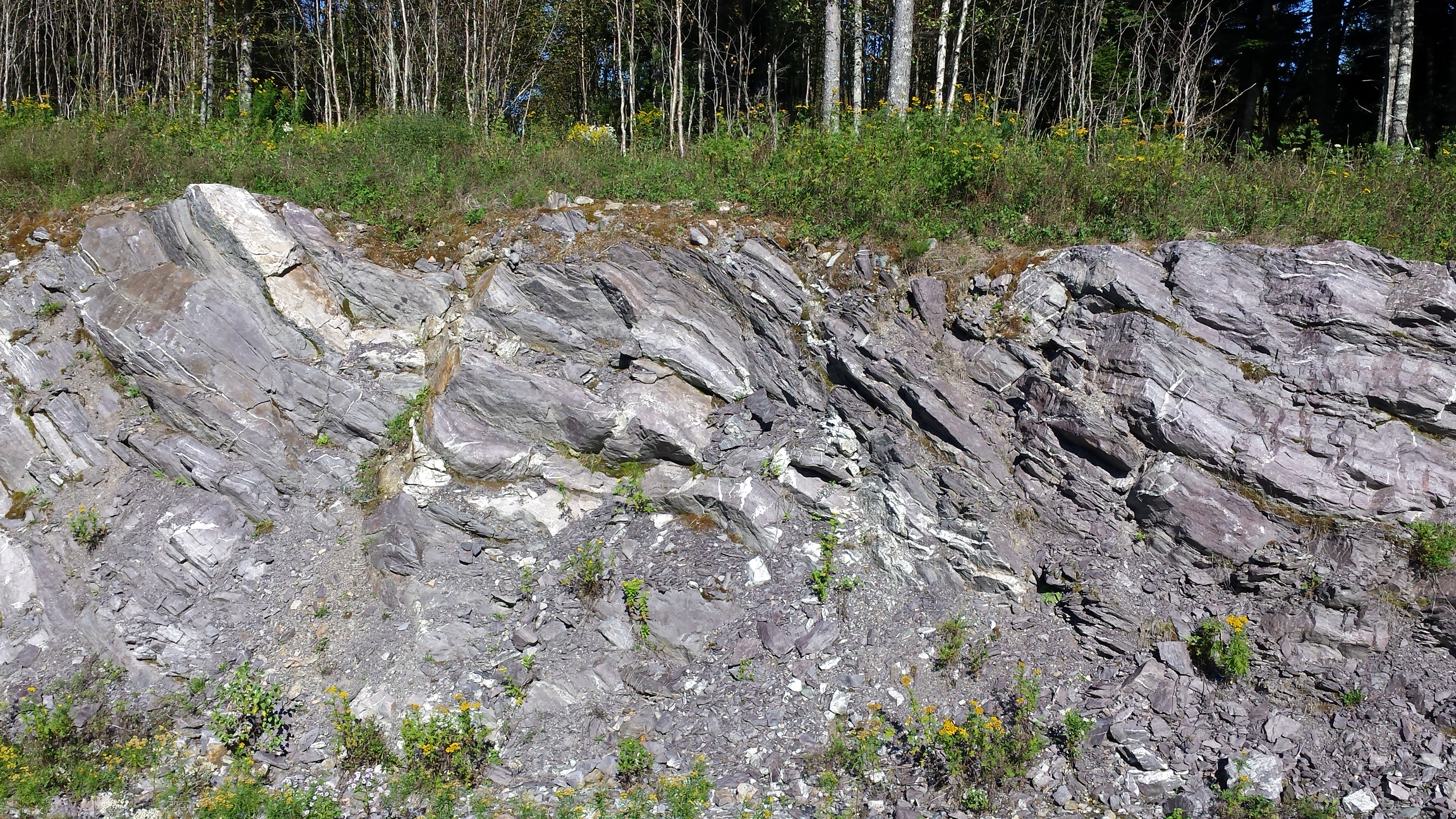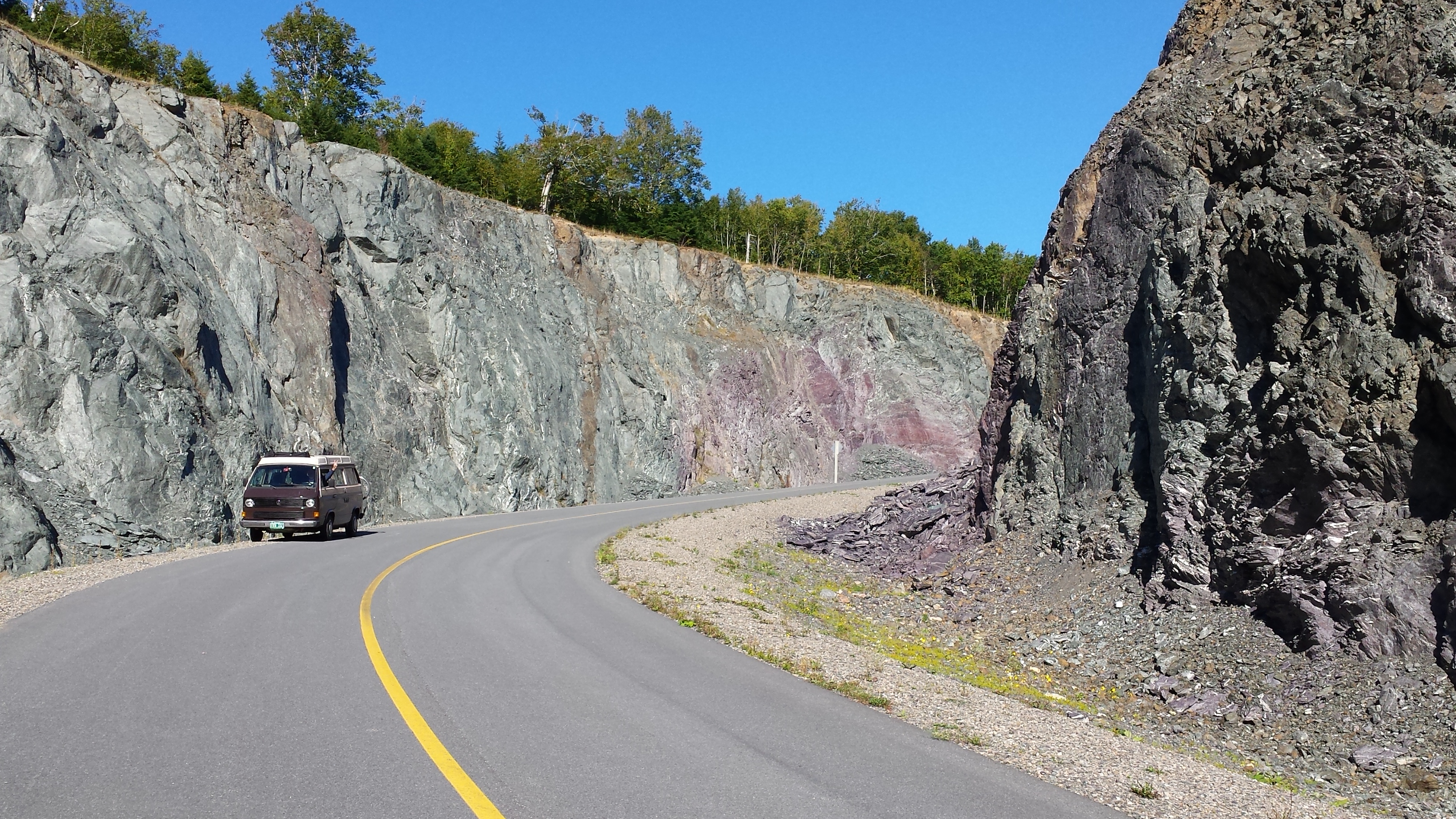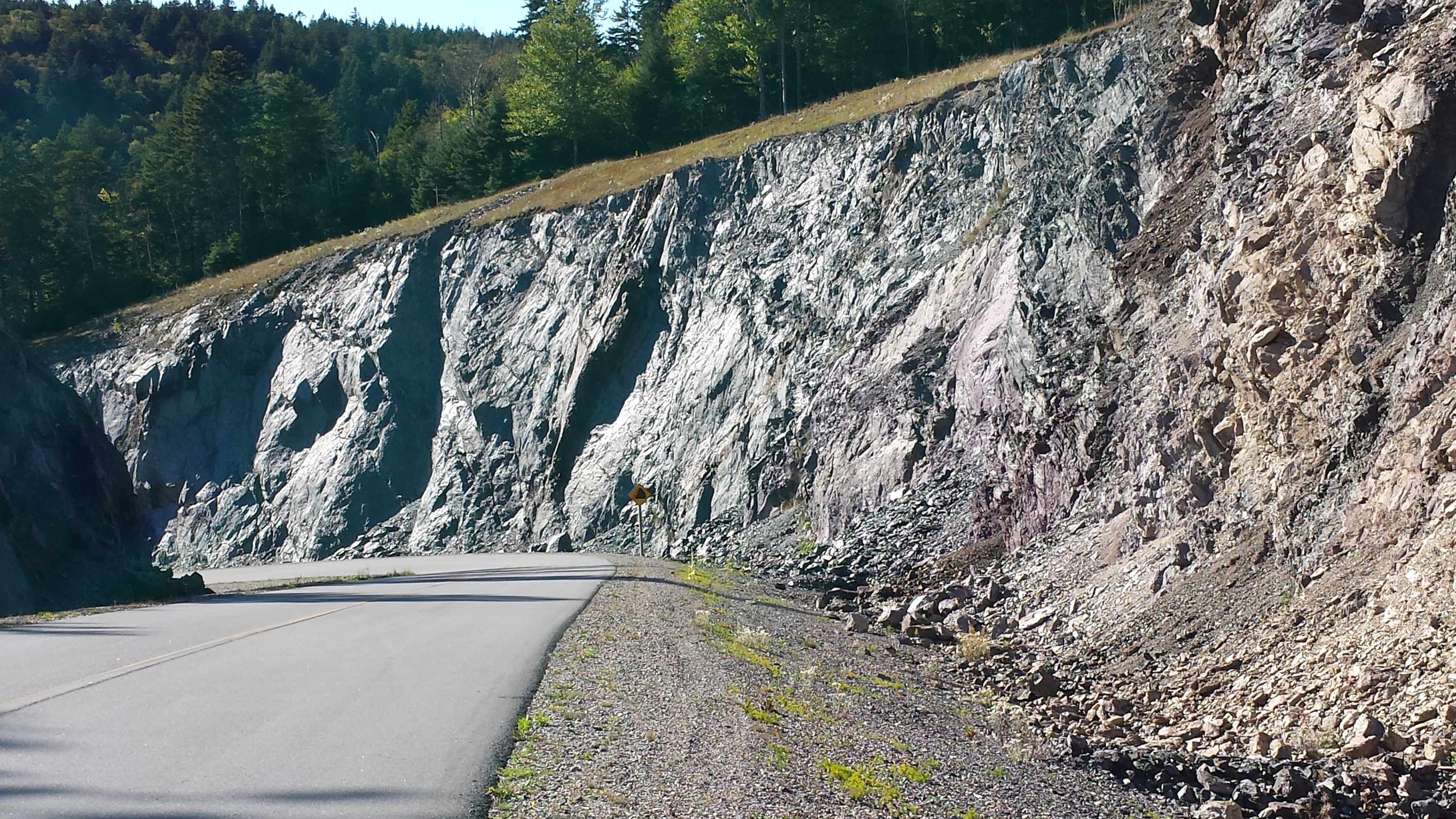 Our original 2014 adventure travel plan — US 2 West, then down the Rockies through Wyoming to Boulder/Denver, included following the Interstate route through Wyoming that got another roadcut fiend, John McPhee, all excited, and which he wrote about in detail in Rising from the Plains, a great read about the geologic history of the Northern Rockies. We were all set to marvel at those road cuts. It was the geologic wonders of New Brunswick and the Bay of Fundy that gave us our alternative destination once our plans had to change, but we didn’t know that the relatively new Fundy Trail Parkway was waiting for us with dozens of fresh “Roadcuts!” Wow. As everywhere along this coastline, bending, folding, piling on, intrusion, uplifts, hundreds of millions of years of “all hell breaking loose” on display. And in case you can’t get here soon enough to see them in their fresh state, before mosses, lichens, mineral leaching and other aging processes dull them, we are pleased to offer you our views.