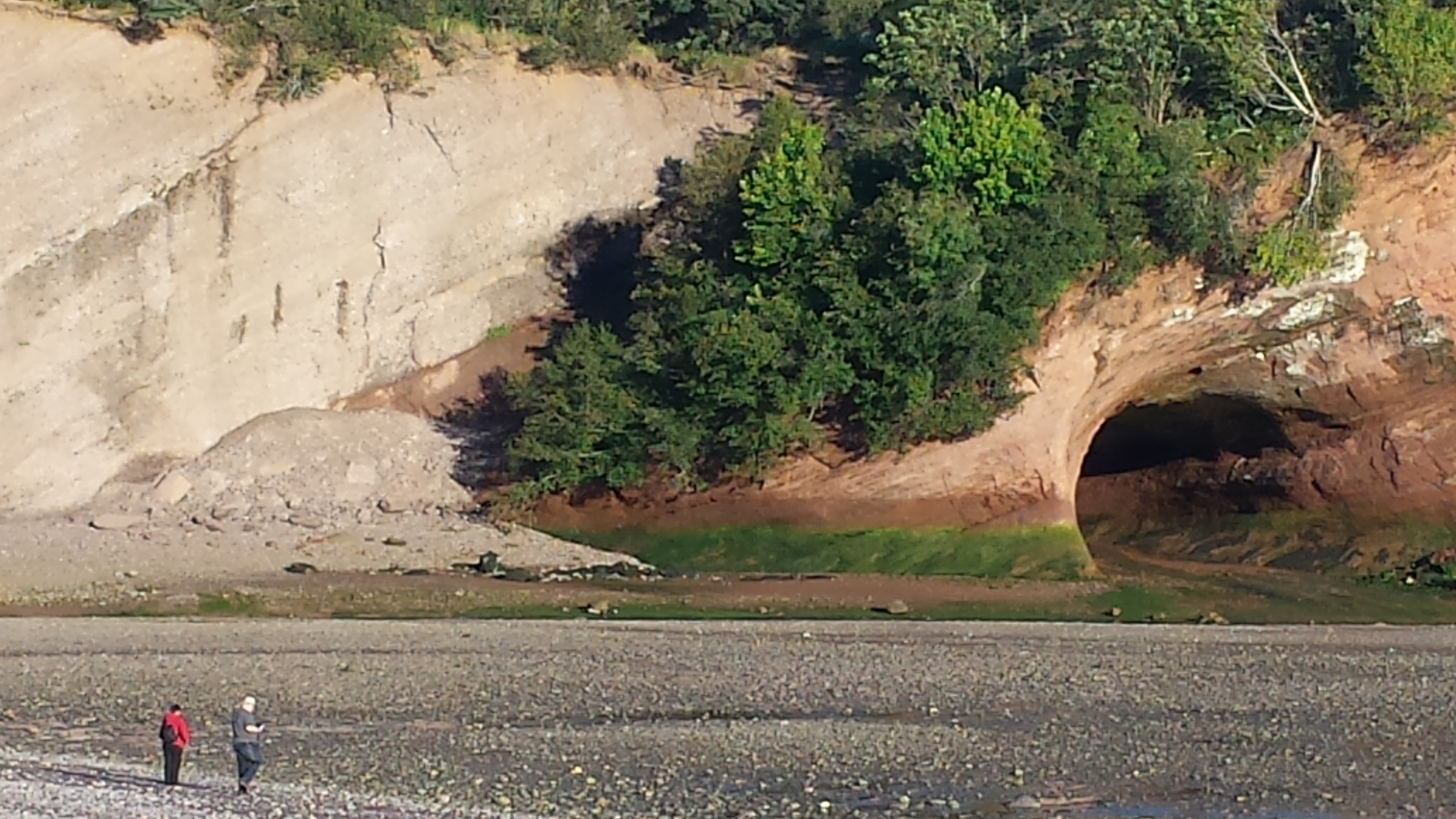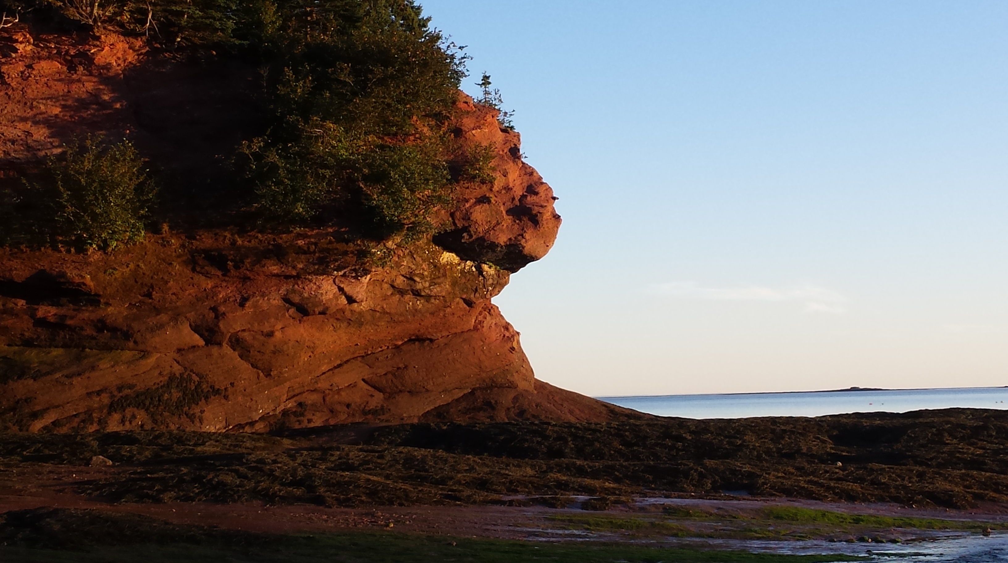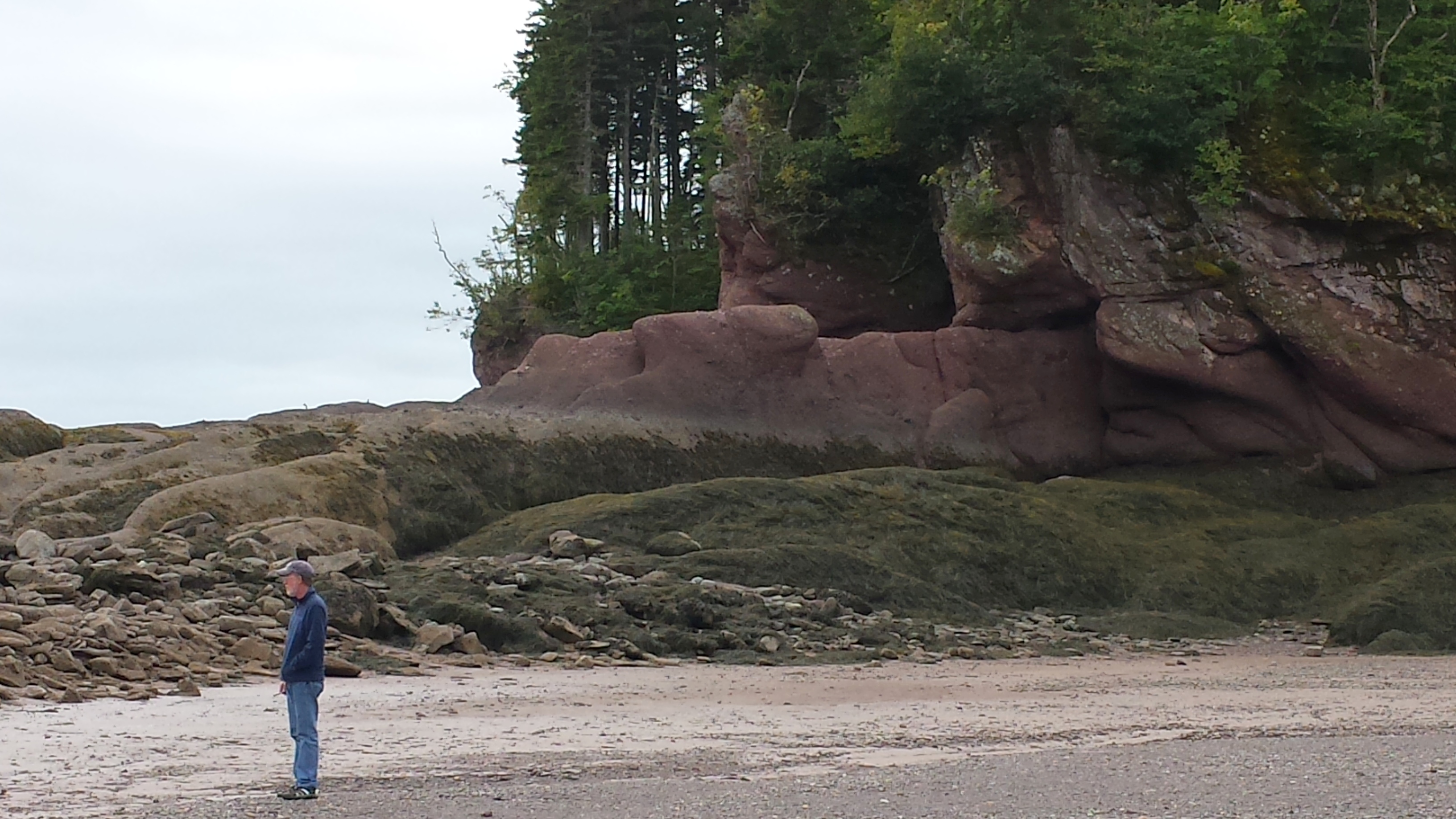 Point Wolfe is a geologist’s paradise. Opposite the grey rocks, you will notice rusty, maroon coloured cliffs towering above you. (JK note: yes, visit at low tide…..)20140914_122252The rusty red cliffs tell a tale of crumbling mountains. These mountains were created by the ancient Pre-Cambrian volcanoes and by the collision of Europe and North America. At one time they rivaled the Rockies in massive splendour. But they were worn down, or eroded, by the passage of time. Water and gravity piled all of the debris at their feet. These boulders and pebbles were later cemented together to form a new rock which we call the Hopewell conglomerate.