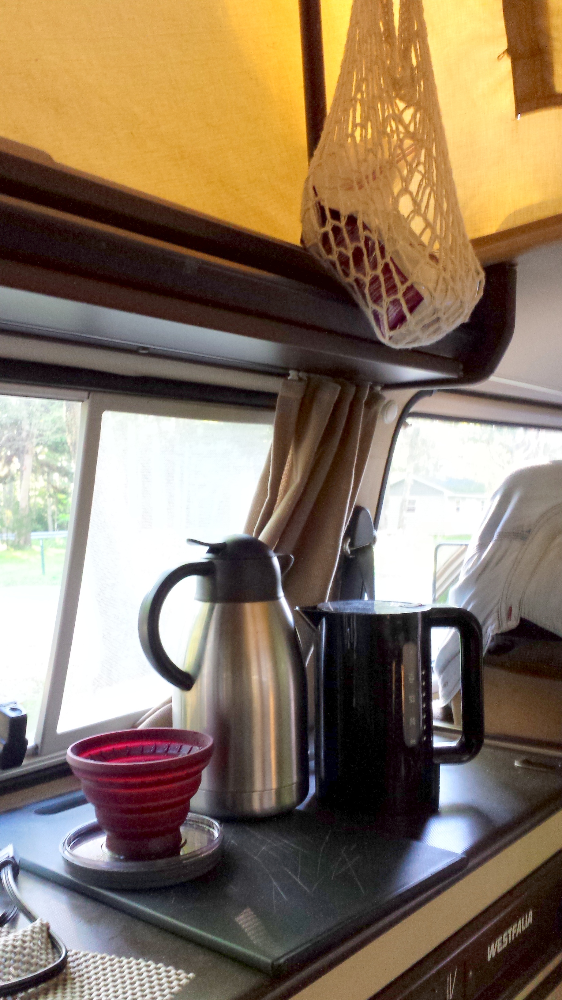 2oldhippies came up with some hacks to help enforce the rules and minimize some kinds of rummaging — such as, crocheting a lot of little bags to gather together stuff that belongs together, to keep it together and make retrieving it easier. One of our little bags contains everything necessary to make the coffee in the morning: filters, a miraculous collapsible silicon filter holder (the red thing to the left of the carafe in picture below), ground coffee, sugar, spoon, and coffee cups. No rummaging required early in the morning – everything needed is already in one place.