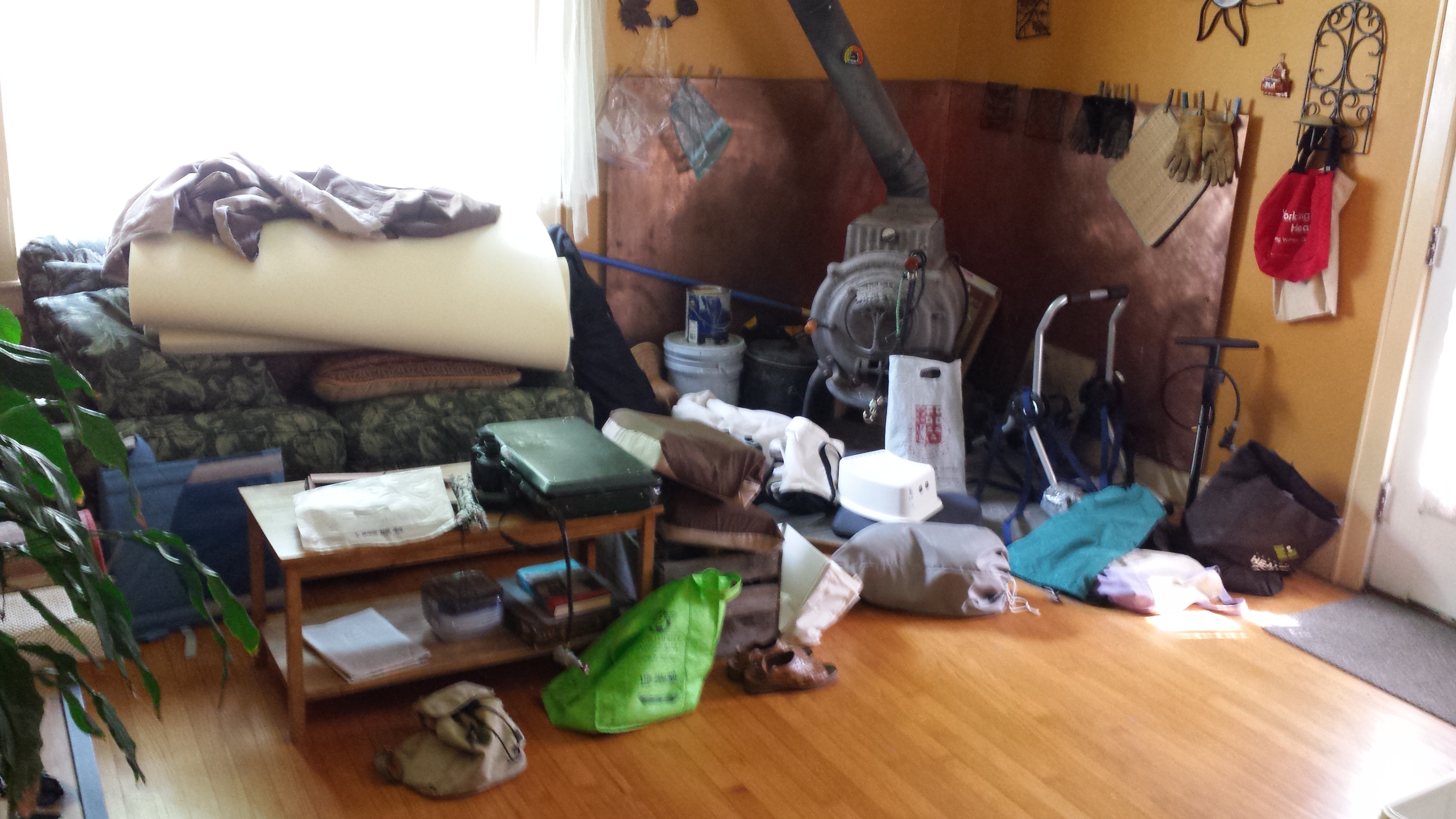Preparation is well underway, as Craig gathers the gear together. Here’s what the staging area (formerly the living room of our house) looks like today. That giant yellow blob is the tempurpedic foam topper we unroll every night for the bed..I sewed up a big case for it, using two really cheap bed sheets from Sears. Unroll, throw on the pillows and blanket and voila, bedtime. Yeah, this is not going to be like the camping trip 30 years ago, not at all!)