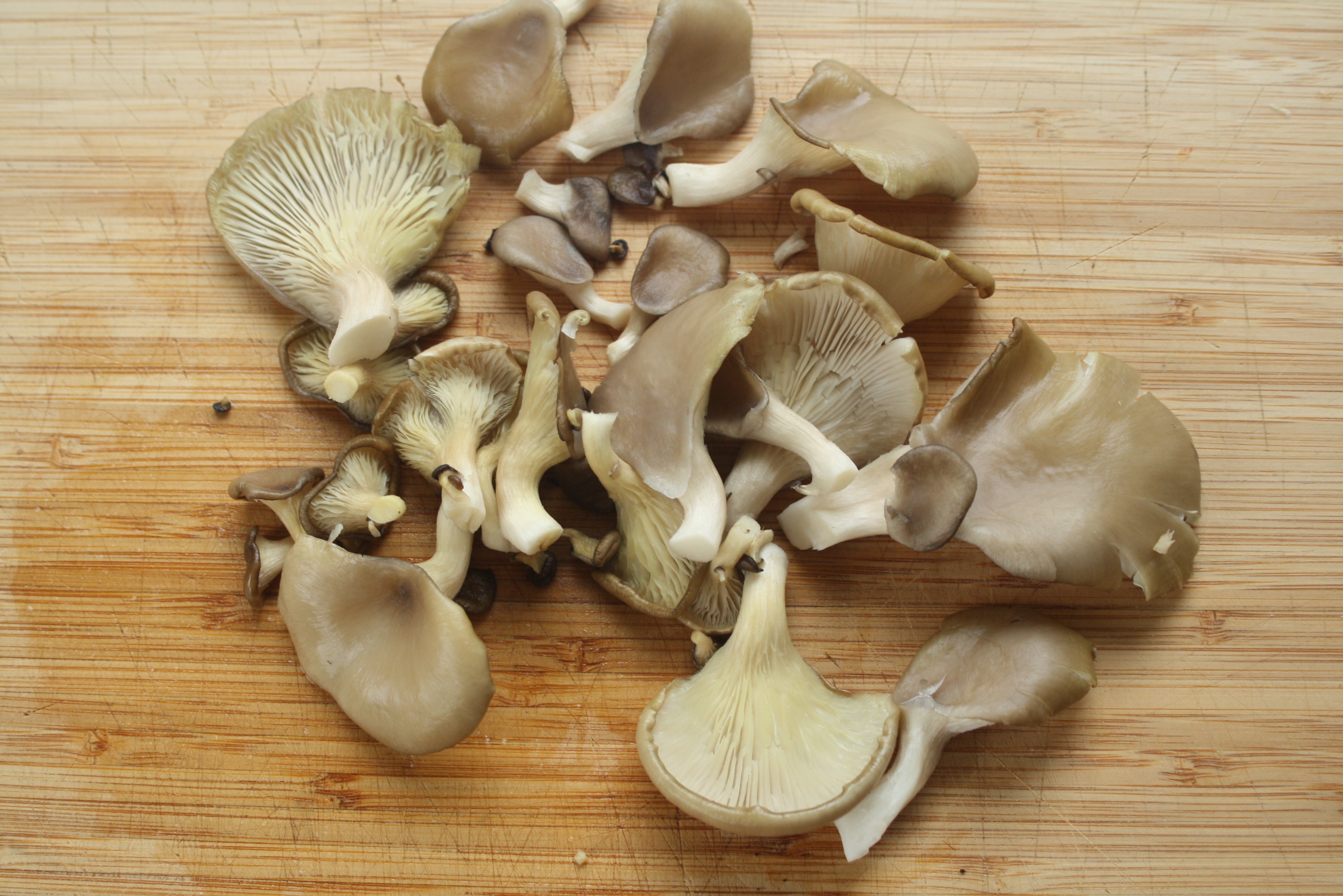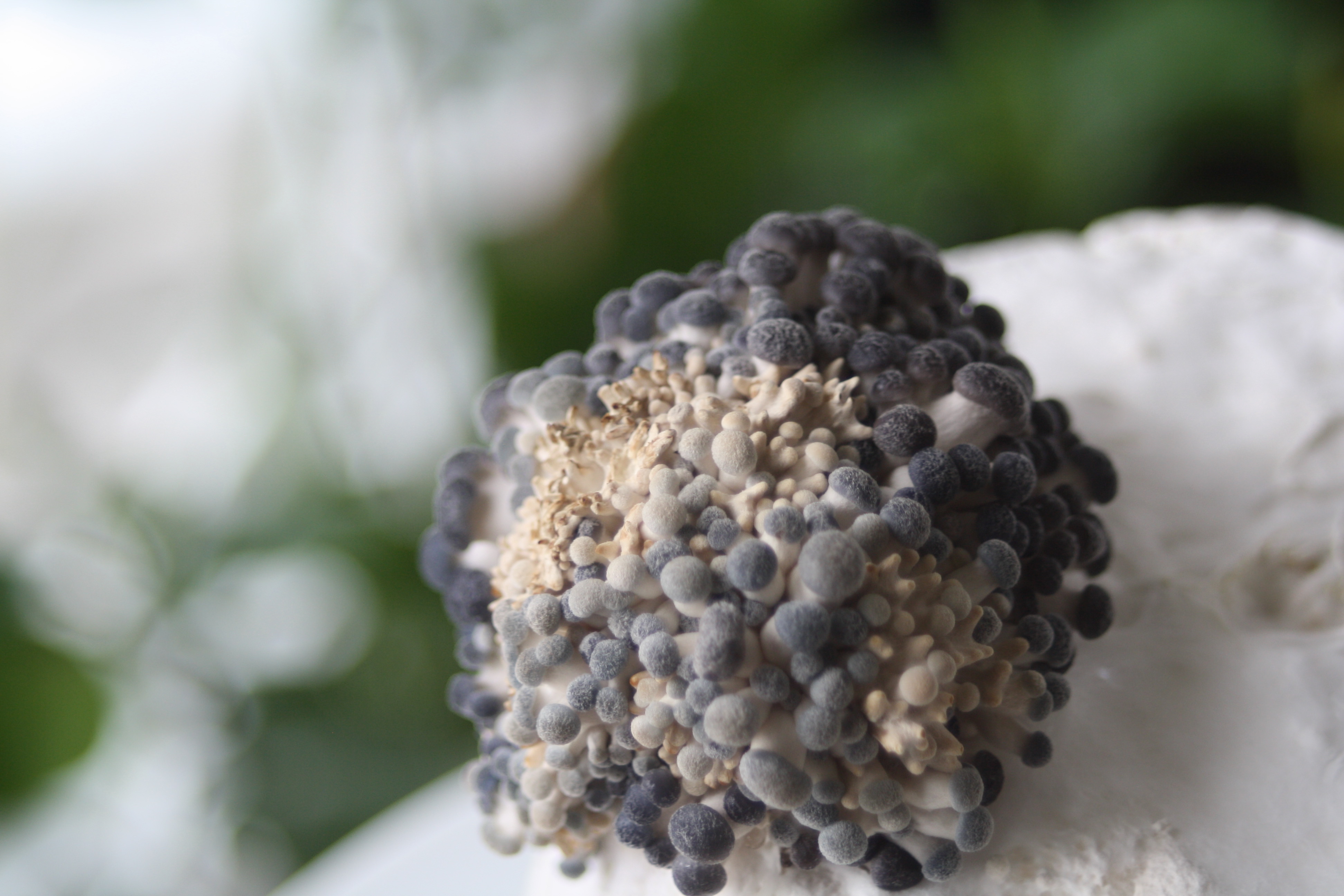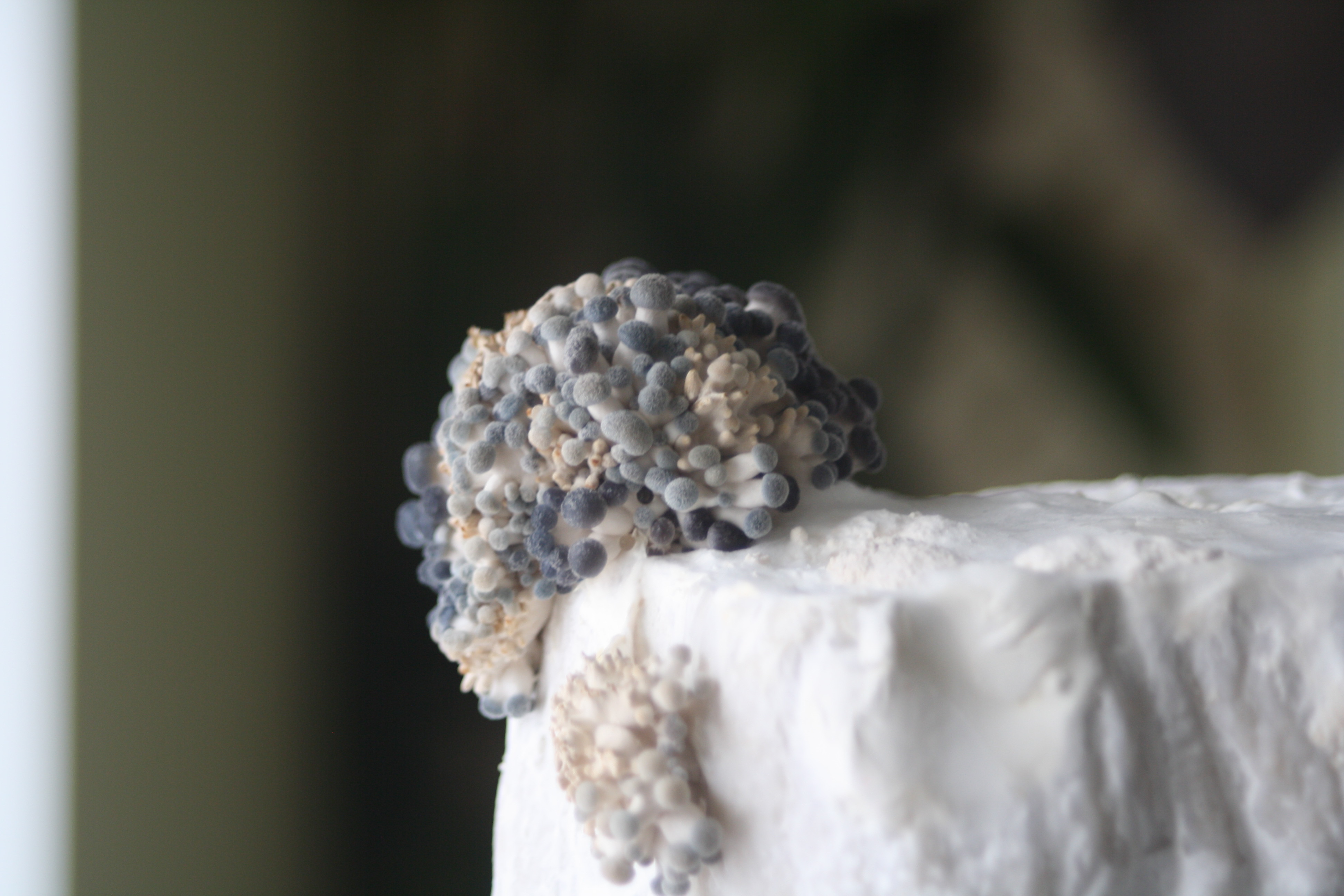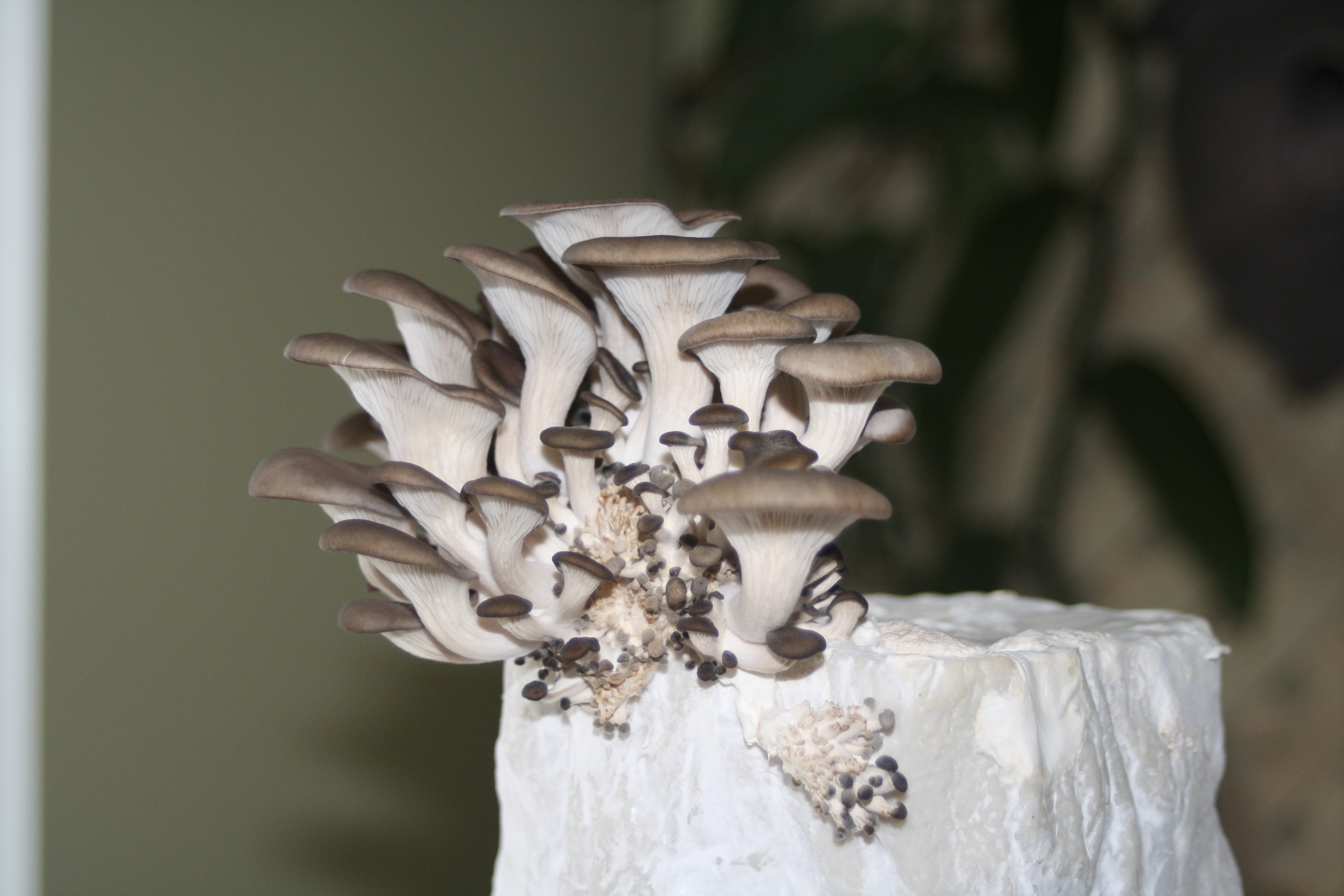 I put the TP in the fridge to “stimulate fruiting.” Pulled it out 48 hours later, and behold: a weird little glob on one edge, a clump of nascent oyster mushrooms.